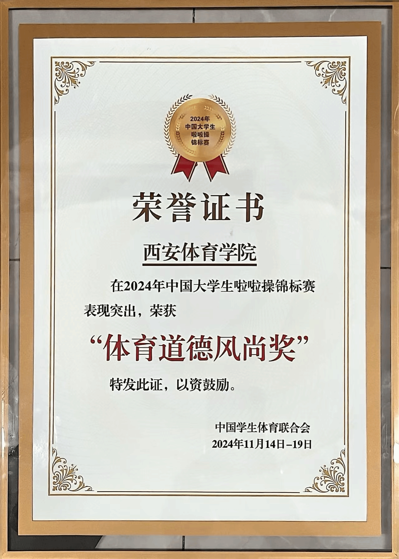 在学校各相关部门大力支持下,教练许波带领由艺术学院15名学生组成的校啦啦操大学生代表队参加了本次比赛,最终获得(高水平组)集体高踢腿啦啦操自选动作第一名、(高水平组)集体高踢腿啦啦操规定动作第一名、(高水平组)集体花球啦啦操规定动作第一名的好成绩。同时,中国学生体育联合会授予我校体育道德风尚奖。